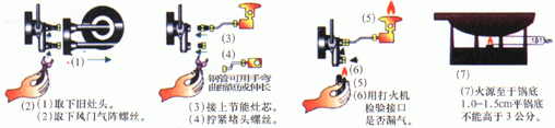 3、將大火眼用螺絲擰緊(一定要在螺紋里加生料帶,防止漏氣。產(chǎn)品里附帶的大片圈可以不用,大片圈防漏氣效果反而沒有生料帶好---生料帶,水管建材店里有售),將節(jié)能灶頭(煤氣節(jié)能器)連接在與開關(guān)手把成直線的出氣眼(即小火眼)上,并且擰緊(一定要加生料帶)。注意點:按裝時不要過分用力擰,以防止螺口破裂,只要多多親自試驗,能很快掌握技巧的。