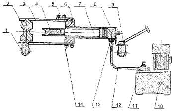 (2) 先將工作油缸(8)旋入方檔塊(6)的內螺紋,使油缸后端裝在支架上的車輪向下。