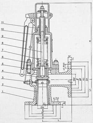 本閥門(mén)實(shí)用于工作溫度≤350℃的蒸汽、空氣等介質(zhì)的設(shè)備或管路上。作為超壓保護(hù)裝置。連接法蘭尺度按JB/T-94的系列。