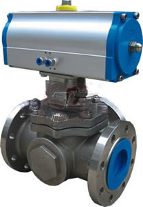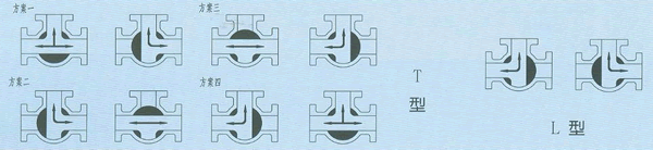 氣動(dòng)三通球閥分L型和T型,介質(zhì)流通方向見下圖。L型三通球閥實(shí)用于介質(zhì)流向的切換,能使相互垂直的兩個(gè)通道連通:T型三通球閥實(shí)用于介質(zhì)的分流、合流或流向切換,T型孔道可以使三個(gè)通道互相連通或使其中兩個(gè)通道連通,三通球閥一般采用兩個(gè)閥座結(jié)構(gòu),亦可根據(jù)用戶請(qǐng)求采用四閥座結(jié)構(gòu)。
