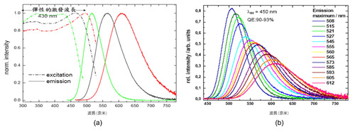 在熒光粉轉(zhuǎn)換白光LED之制作上,硅酸鹽為另一種重要新選擇,因該材料具有對(duì)紫外、近紫外、藍(lán)光具有明顯之吸收;在所有黃光熒光體中,具有最高輝度值;輸出量子效率高于90%,并仍有改善空間;量產(chǎn)制備本錢低廉;在紫外LED應(yīng)用時(shí),具有高溫度穩(wěn)定性(至少120℃以上);具有具物理(如高強(qiáng)輻射)與化學(xué)穩(wěn)定性,抗氧化、抗潮、不與封裝樹(shù)脂作用;以及可搭配紫外/藍(lán)光芯片,可供制作各種色溫的白光LED的條件?! D2(a)與(b)分別顯示具有高度彈性激發(fā)帶寬的硅酸鹽熒光粉激發(fā)光譜和Sr2+摻雜量對(duì)(Ba1-XSrX)2SiO4:Eu2+硅酸鹽熒光體發(fā)光波長(zhǎng)之效應(yīng)。上述光譜學(xué)特性顯示(Ba1-XSrX)2SiO4:Eu2+熒光粉之獨(dú)特性,也說(shuō)明為何硅酸鹽熒光粉成為目前業(yè)界制作白光LED的熱門材料之一。