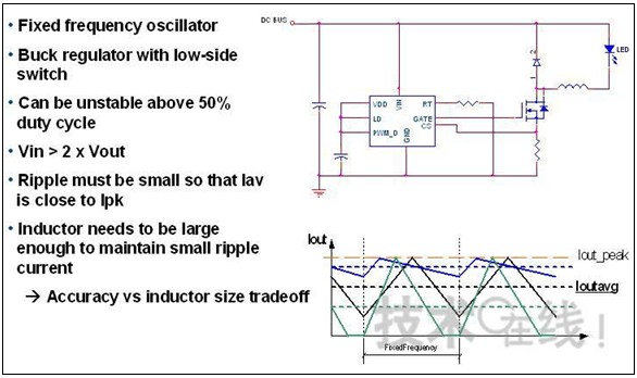國際整流器(IR) 節(jié)能產(chǎn)品LED部經(jīng)理Peter Green補充了以下幾點:正向電壓的Part-to-part變化、溫度變化、負溫度系數(shù),動態(tài)阻抗低,色彩與色度的轉(zhuǎn)換等。他以為現(xiàn)有峰值電流降壓穩(wěn)壓器方案需要進行很多改進(見圖20)。