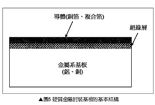 圖5是硬質(zhì)金屬系封裝基板的基本結(jié)構,它是利用傳統(tǒng)樹脂基板或是陶瓷基板,賦寧波信息網(wǎng)予高熱傳導性、加工性、電磁波遮蔽性、耐熱沖擊性等金屬特性,構成新世代高功率LED封裝基板。