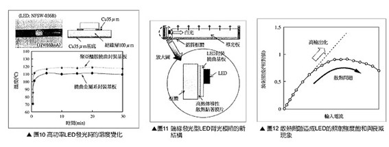 由圖8可知使用高熱傳導性盡緣層封裝基板,可以大幅降低LED芯片的溫度。此外基板的散熱設計,透過散熱膜片與封裝基板的組合,還可看延長LED芯片的使用壽命。