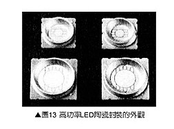 圖13是高功率LED陶瓷封裝的外觀;圖14是高功率LED陶瓷封裝的基本結(jié)構,圖14(b)的反射罩電鍍銀膜。它可以進步光照射率,圖14(c)的陶瓷反射罩則與陶瓷基板呈一體結(jié)構。