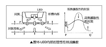 圖15表示LED內(nèi)部理想性熱流擴散模式,圖15右圖的實線表示封裝內(nèi)部P~Q之間高熱流擴散分布非常平坦,由于熱流擴散至封裝整體均勻流至封裝基板,其結(jié)果使得LED芯片正下方的溫度大幅降低。