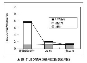 圖17是熱傳導差異對封裝內(nèi)部的溫度分布,與熱流束特性的模擬分析結(jié)果,封裝基板使用氮化鋁。根據(jù)仿真分析結(jié)果顯示LED接合部的溫差,熱傳導性非常優(yōu)秀的Au-Sn比低散熱性銀充填環(huán)氧樹脂接合劑更優(yōu)秀。