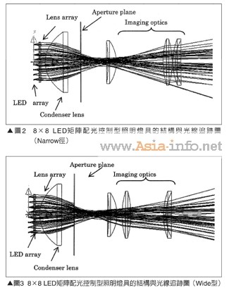 復(fù)數(shù)LED當(dāng)作配配光控制型照明燈具使用時(shí),必須結(jié)合高功率發(fā)光二極管與光學(xué)系統(tǒng),利用鏡片數(shù)組(Array)將發(fā)光二極管產(chǎn)生的光線準(zhǔn)直化(Collimate),接著再透過聚光鏡片(Condenser Lens)使光線在開口處混合集光,最后再利用成像光學(xué)系統(tǒng)使該開口光源影像變倍投影,進(jìn)行所謂的“配光控制”。此外使用鏡片數(shù)組與聚光鏡,還可以消除照射面的亮度不均與色不均等題目。