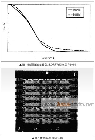 圖4是已經(jīng)模型化的LED鏡片、發(fā)光部與LED整體的模型;圖5是使用上述模型利用仿真分析獲得的配光分布與實(shí)測(cè)值;圖6是實(shí)際光源模塊外觀。