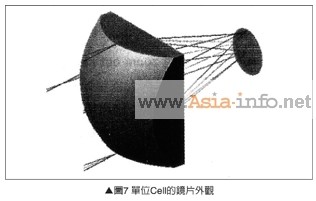 鏡片數(shù)組的設(shè)計(jì) 鏡片數(shù)組是整合64個(gè)對(duì)應(yīng)發(fā)光二極管,由12.5×12.5mm大小,壓克力(PMMA: Poly Methyl Methacrylate)制成的矩形鏡片Cl構(gòu)成,鏡片數(shù)組可以使發(fā)光二極管產(chǎn)生的光線準(zhǔn)直化。鏡片數(shù)組從鏡片背面至焦點(diǎn)的間隔為13.5mm,固然增加該焦點(diǎn)間隔,準(zhǔn)直化的光線散亂比較少,而且聚光鏡片的集光效率可以大幅進(jìn)步,然而相同N/A值,單位Cell的口徑會(huì)變大,整體外形尺寸也會(huì)隨著暴增,因此設(shè)計(jì)上以降低球面收差為主要訴求。圖7是單位Cell的鏡片外觀,Cell的外形如圖所示呈平凸鏡片狀,凸出部位主要是為補(bǔ)正收差,刻意制成Koninck外形。