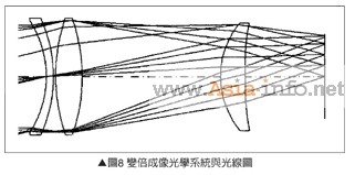 變倍成像鏡片的設(shè)計(jì) 一般大型照明燈具,例如變倍投影的照明燈具大多采用2群2片成像鏡片設(shè)計(jì),很少設(shè)置收差補(bǔ)正鏡片。新型大型照明燈具使用的鏡片,采用很重視成像特性的鏡片系統(tǒng),同時(shí)針對(duì)發(fā)光二極管與鹵素?zé)粽彰鳠艟叩牟町慄c(diǎn),例如分光強(qiáng)度與開口口徑進(jìn)行確認(rèn)。成像鏡片采用3群3片全長(zhǎng)固定型變倍鏡片(Zoom Lens)設(shè)計(jì),可在100~150mm焦點(diǎn)范圍進(jìn)行變倍投影,圖8是變倍成像光學(xué)系統(tǒng)與光線圖。