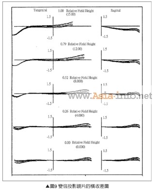 此外為補(bǔ)正各收差,各鏡片使用分散相異的光學(xué)玻璃,配合非球面化設(shè)計(jì)進(jìn)行收差補(bǔ)正,因此3片鏡片之中的2片鏡片使用高次非球面鏡片。圖9是變倍投影鏡片的橫收差圖,由圖可知大型照明燈具的光學(xué)系統(tǒng),在有效變倍范圍可以獲得充分的收差補(bǔ)正。