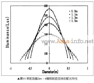 配光量測(cè) 配光量測(cè)的照射間隔為3m,依此量測(cè)照射壁面時(shí)的照度,接著針對(duì)目視與配光量測(cè)結(jié)果進(jìn)行評(píng)鑒。圖11是照射間隔3m,4種照射直徑時(shí)的配光特性測(cè)試結(jié)果,由圖可知新世代大型照明燈具可以獲得低照度不均、良好的配光特性。此外3m照射間隔的中心照度,0.9m最小照射直徑與1.5m最大照射直徑時(shí),可以獲得570流明(lm)與300流明(lm)實(shí)用等級(jí)的照度與配光特性。