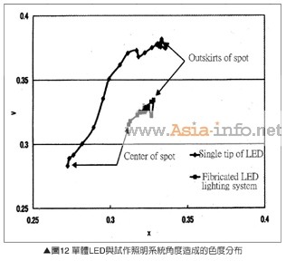 如圖12所示發(fā)光二極管單體的場(chǎng)合,中心部位的色度分別是x=0.2742,y=0.2831比較偏藍(lán)色,距 離光軸16°的位置x=0.3114,y=0.3704,周邊部位30°的位置x=0.3358,y=0.3745,隨著角度不同色度變化非常明顯,即使目視都可以分辨照射光中心部位與周邊部位顏色差異。