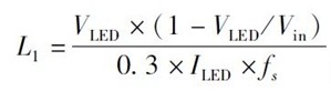 電感L1取值與LED 電流的紋波值有關,一般限制紋波系數(shù)最大為0. 3,電感值的計算公式為: