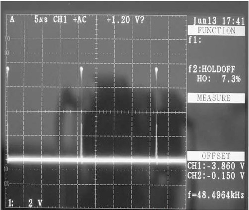 圖3 為施加到開關器件柵極的PWM 開關控制信號波形,其周期為14 μs,幅值8 V,占空比8. 3%,周期和預設值有一定差距,這主要是電阻RT阻值誤差造成的頻率設置偏差。圖4 是LED 負載中電流的波形。測量過程是在LED 負載回路中串入0. 5 Ω 電阻測量其兩端的電壓波形,利用電阻的線性特性來反映電流特性。從波形上看,電流按照鋸齒波形周期性變化,峰峰值為40 mV,計算得到其電流紋波為80 mA,輸出電流均值為350 mA,經(jīng)過計算得到其紋波系數(shù)為22. 9%。