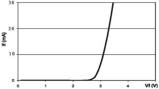 LED的伏安特性和普通的二極管相似。用于白光的藍(lán)光LED典型的伏安特性如圖1所示。