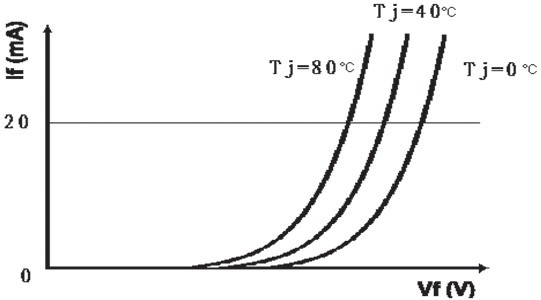 LED的伏安特性和其它二極管一樣具有負(fù)溫度系數(shù)的特點(diǎn),即在結(jié)溫升高時(shí)I/V曲線出現(xiàn)左移現(xiàn)象,如下圖所示。