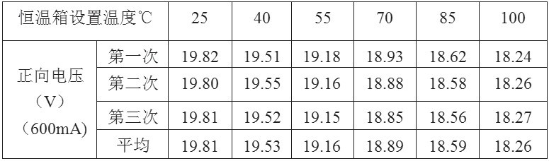 確定正向電壓與結(jié)溫的關(guān)系的試驗(yàn)步驟為:1)寧波地圖將光源置入恒溫箱中;2)設(shè)置恒溫箱的溫度;3)待恒溫箱內(nèi)溫度充分平衡穩(wěn)定后,在光源兩端接入恒流源;4)迅速測(cè)量光源的正向電壓并記錄;5)重復(fù)上述步驟1)~(4),恒溫箱溫度由低到高,測(cè)得多點(diǎn)數(shù)據(jù)。