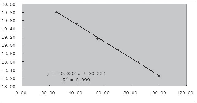 因測(cè)試時(shí)間較短,可以將測(cè)量時(shí)恒溫箱設(shè)置溫度近似等于LED光源的結(jié)溫。在600mA恒流的情況下,通過數(shù)學(xué)方法不難得出光源模塊正向電壓與結(jié)溫的關(guān)系。利用Exc工具,以溫度為X軸,平均值為Y軸,生成(X,Y)散點(diǎn)圖,選擇線性回歸分析類型則可生成如下趨勢(shì)圖和公式。
