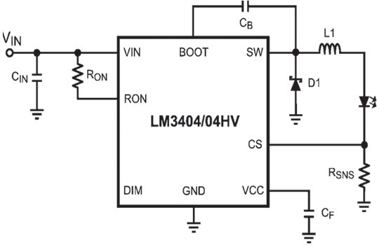 LM3404應(yīng)用十分簡(jiǎn)單,一個(gè)用LM3404的典型應(yīng)用如圖6所示。