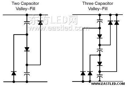 業(yè)界有關(guān)無(wú)源(Passive)功率因數(shù)校訂(PFC)的計(jì)劃眾多,這些計(jì)劃通常都應(yīng)用較多的額外元器件,其中的一種計(jì)劃就是谷底填谷(valley-fill)整流器,其中采用的電解電容和二極管組合增大了線路頻率導(dǎo)通角,從而改良功率因數(shù)。實(shí)際上,這個(gè)過(guò)程利用高線路電壓以低電流給串聯(lián)電容充電,然后在較低電壓時(shí)以較大電流讓電容放電給開關(guān)穩(wěn)壓器。典范利用應(yīng)用2個(gè)電容和3個(gè)二極管,而要進(jìn)一步加強(qiáng)功率因數(shù)性能,則應(yīng)用3顆電容和6個(gè)二極管。