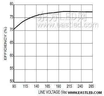 相干測(cè)試數(shù)據(jù)是NCP1014LEDGTGEVB評(píng)估板在負(fù)載為4顆LED、工作電流約為630 mA條件下測(cè)得的,除非另行有闡明。圖3及圖4是不同條件下的能效丈量數(shù)據(jù)。圖5顯示的是不同線路電壓條件下的功率因數(shù)。需要指出的是,輸進(jìn)電壓在90 Vac至135 Vac范疇內(nèi)時(shí),功率因數(shù)高于0.8,遠(yuǎn)高于“能源之星”的LED住宅照明利用功率因數(shù)請(qǐng)求。