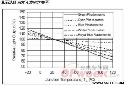 當(dāng)LED熱源無法有效導(dǎo)出,將導(dǎo)致LED界面溫度(Junction Temperature)升高,隨之影響到的將是光的輸出效率遞減。