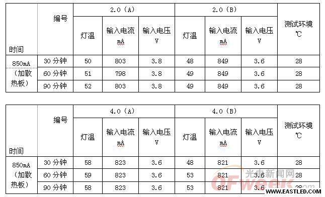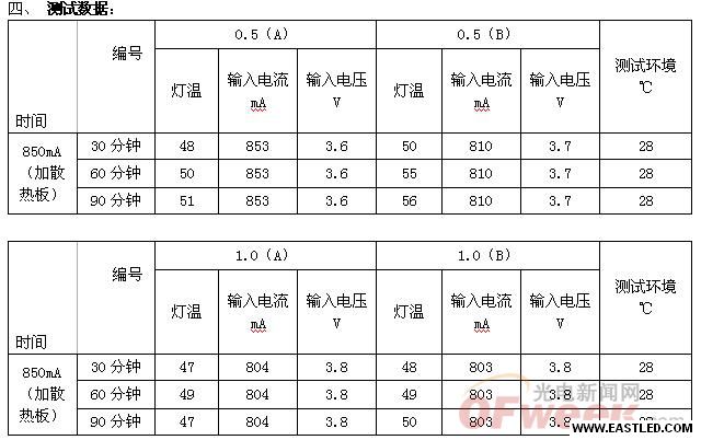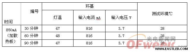 分辨輸進(jìn)直流350mA 和700mA 電流,按照表格里面的條件進(jìn)行工作,并記錄溫度(在