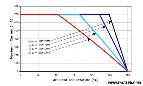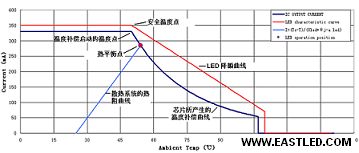 一般而言,大功率LED的產(chǎn)品規(guī)格書中都會(huì)標(biāo)明不同環(huán)境溫度(或LED焊點(diǎn)的溫度)下的最高允許輸出電流(如圖1)的曲線圖。當(dāng)四周溫度低于安全溫度點(diǎn),輸出最高允許電流保持不變;當(dāng)高于安全溫度點(diǎn),輸出最高允許電流隨四周溫度升高而下降,即所謂的降額曲線。為確保LED的性能壽命不受影響,必需保證LED工作在降額曲線與橫、縱坐標(biāo)軸所包絡(luò)的安全區(qū)內(nèi)。