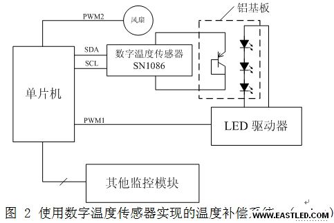 圖2為此類系統(tǒng)驅(qū)動(dòng)單路LED串的示意圖。溫度檢測(cè)部分采用了矽恩微電子公司生產(chǎn)的高精度數(shù)字溫度傳感器SN1086,SN1086可以同時(shí)檢測(cè)芯片本身溫度,相當(dāng)于間接檢測(cè)PCB溫度,又能檢測(cè)遠(yuǎn)端三級(jí)管溫度,若將三極管與LED一同焊接在鋁基板上便可以檢測(cè)鋁基板溫度。SN1086將檢測(cè)到的兩種溫度通過芯片內(nèi)部的高精度Delta-Sigma ADC進(jìn)行模數(shù)轉(zhuǎn)換,將溫度的數(shù)字成果通過I2C總線的SDA數(shù)據(jù)線和SCL時(shí)鐘線與單片機(jī)通信。當(dāng)單片機(jī)接收到鋁基板溫度成果后與預(yù)設(shè)定的安全溫度點(diǎn)閾值進(jìn)行比對(duì),當(dāng)溫渡過高時(shí)啟動(dòng)溫度補(bǔ)償程序,通過PWM1按比例下降LED驅(qū)動(dòng)器的輸出電流。單片機(jī)同時(shí)監(jiān)控PCB板溫度,溫渡過高時(shí)通過PWM2信號(hào)線把持風(fēng)扇對(duì)PCB進(jìn)行散熱,確保板上的元器件尤其是電解電容的溫度不會(huì)過高。