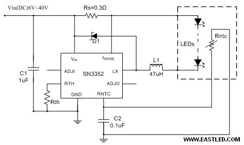 若能將溫度補(bǔ)償功效集成在芯片內(nèi)部,這將極大下降應(yīng)用本錢和所占空間。SN3352正是為了這個(gè)目標(biāo)而設(shè)計(jì)出來的芯片,SN3352是降壓型DC-DC恒流芯片,工作電壓范疇6~40V,輸出電流達(dá)700mA,溫度補(bǔ)償未啟動(dòng)時(shí)恒流性能精良,實(shí)用于驅(qū)動(dòng)串聯(lián)的1W或者3W LED燈。SN3352具備調(diào)光功效,通過轉(zhuǎn)變ADJI引腳的模仿電壓或者對(duì)此引腳施加PWM信號(hào)都能實(shí)現(xiàn)調(diào)光功效。SN3352內(nèi)部集成了矽恩微電子自有專利技巧的溫度補(bǔ)償電路,溫度補(bǔ)償功效需要外接一個(gè)普通電阻Rth用于設(shè)置溫度補(bǔ)償啟動(dòng)的溫度點(diǎn)Tth和一個(gè)檢測(cè)溫度的負(fù)溫度系數(shù)熱敏電阻Rntc配合實(shí)現(xiàn)。
