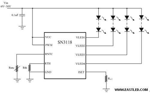 圖6 SN3118驅(qū)動(dòng)LED典范利用圖