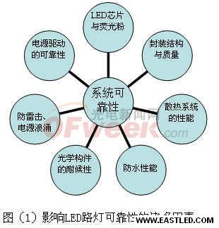 近年來,在戶外照明范疇,新型LED路燈正引起眾多產(chǎn)業(yè)界和投資者的關注,全國有數(shù)百家企業(yè)推出了各自的LED路燈產(chǎn)品,幾乎各個城市都有或多或少的LED路燈已經(jīng)安裝到城市的干道上。然而在眾多的產(chǎn)品序列中,良莠不齊,一些產(chǎn)品仍欠完善,其中標題最大的是LED路燈的整體可靠性。LED道路照明系統(tǒng)不同于傳統(tǒng)照明燈具,相對要復雜得多,影響整體可靠性的因素也多。參見圖(1)。