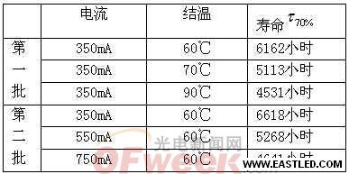 在功率型發(fā)光二極管利用中,影響壽命的兩個重要應力是溫度和電流,因此本實驗中利用溫度和電流兩個應力分辨對器件進行加速老化,分析壽命分辨和溫度、電流的關系。