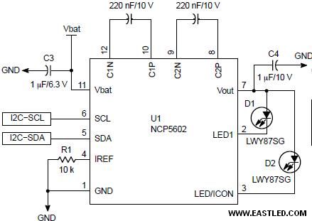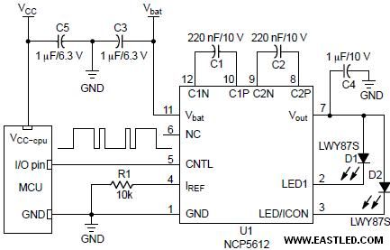 圖4:采用線性穩(wěn)壓器NUD4301做為推動小型LCD面板背光的兩顆LED驅(qū)動電路。