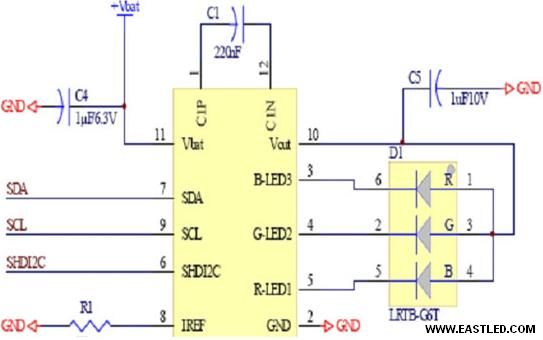 圖2:具備I2C把持接口的典范RGB LED驅(qū)動芯片利用。