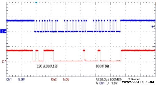 由處理器送到驅(qū)動芯片的數(shù)據(jù)字節(jié)中的B5代表的是ICON模式的狀態(tài),當B5為LOW時,表現(xiàn)應用的是正常的背光模式,每個LED的電流可以在0mA~30mA之間調(diào)劑,當B5為HIGH時,那么就會啟動ICON模式,并且只會將450μA的電流送到所連接的兩顆LED中的一個上,在這個器件中ICON模式的電流值為固定值,但在類似NCP5612的產(chǎn)品上,這個電流則可以通過單線式通信協(xié)議來加以把持,圖3顯示了通過I2C通信協(xié)議中SCL與SDA連接線的ICON把持程序。
