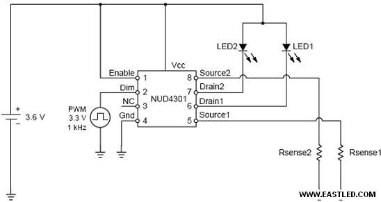 在應用具備約3.3V較低正向電壓的猬集式LED時,可選擇線性穩(wěn)壓器供給驅(qū)動電流,線性穩(wěn)壓器與開關轉(zhuǎn)換器比擬,上風在于較低本錢及較低電磁干擾,因線性穩(wěn)壓器只需在驅(qū)動芯片的外圍參加幾顆電阻,且無需應用開關器件,但這類解決計劃的毛病是下降了電池電壓工作范疇,圖4顯示應用NUD4301低壓降線性穩(wěn)壓器做為兩顆LED驅(qū)動電路的情況,依尺度0.2V壓降及3.3V的LED正向電壓考慮,穩(wěn)壓器將在電池電壓低于3.5V時離開穩(wěn)壓模式進進飽和模式,這將造成穩(wěn)壓器輸出電流大幅下滑且LED亮度變暗。但若最低電池電壓在可接收范疇,則線性穩(wěn)壓器還是小型LCD面板最具本錢效益的背光解決計劃。