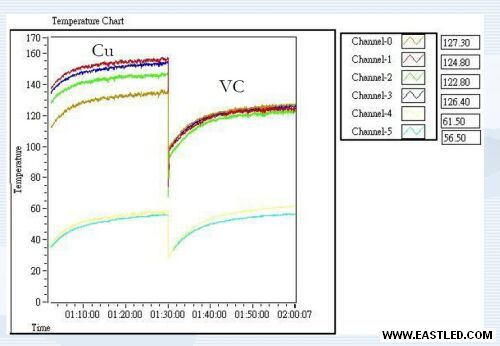 圖2:采用均熱板(VC)和采用銅基底(Cu)的高功率LED燈的溫度對(duì)照。