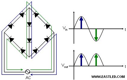 當(dāng)電壓為順向偏壓時(shí),電流會(huì)順著某一方向流出,通過(guò)發(fā)光二極管使其發(fā)光;當(dāng)電壓為逆向偏壓時(shí),電流往反方向運(yùn)動(dòng),使另一邊的發(fā)光二極管發(fā)光。本來(lái)輸進(jìn)的交換電,透過(guò)橋式電路整流后會(huì)轉(zhuǎn)變其波型;而橋式整流過(guò)程中會(huì)有漏電情況產(chǎn)生,輸出的電壓情勢(shì)較接近直流電。