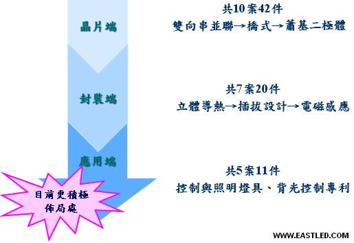 目前全球LED市場(chǎng)競(jìng)爭(zhēng)的如火如荼,舊有LED廠商積極朝高低游垂直整合發(fā)展,而各大集團(tuán)也將其事業(yè)版圖拓展至LED產(chǎn)業(yè),將LED產(chǎn)業(yè)發(fā)展推向新的戰(zhàn)國(guó)時(shí)代。反觀AC LED的發(fā)展,除了臺(tái)灣以外,僅有韓國(guó)首爾半導(dǎo)體動(dòng)作最為積極,美國(guó)的研發(fā)僅停留在實(shí)驗(yàn)室階段,日本大廠則尚無(wú)任何相干布局。因此臺(tái)灣AC LED在專利上的布局應(yīng)更加快腳步,才干有機(jī)會(huì)在未來(lái)的數(shù)年內(nèi)成為AC LED產(chǎn)業(yè)的領(lǐng)頭羊。