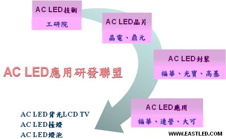 由于AC LED產(chǎn)業(yè)必需積極拓展利用端需求,工研院與業(yè)界共同合作,在2008年10月成立「AC LED利用研發(fā)同盟」,目前在中上游端僅晶電和鼎元獲得工研院專利授權(quán),封裝方面則由福華最先試產(chǎn),隨后參加光寶和高基共同為封裝技巧精進(jìn)。目前在利用端僅有照明和背光源產(chǎn)品,未來(lái)仍有相當(dāng)大的發(fā)展空間。