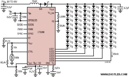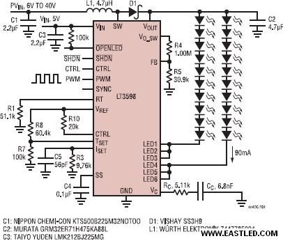 LT3598 是一款具有一個(gè)內(nèi)置電源開關(guān)的通用型LED驅(qū)動(dòng)器,合適驅(qū)動(dòng)多串LED。憑借其堅(jiān)固的故障檢測功效,甚至還可以供給高PWM調(diào)光比。此外,當(dāng)所有的LED串均開路時(shí),一個(gè)電壓環(huán)路將調(diào)節(jié)輸出電壓。