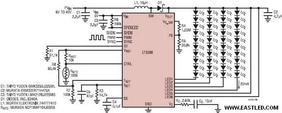 需要一種更好的驅(qū)動(dòng)器以使 LED 背光源的本錢和復(fù)雜性與CCFL大致相當(dāng)。通過以高達(dá)每串30mA 的電流來驅(qū)動(dòng)6串各由10個(gè)LED 組成的LED串,LT3598 滿足了上述請求。該器件還具有一個(gè)內(nèi)置的電源>開關(guān)以節(jié)儉空間和設(shè)計(jì)時(shí)間。效率通過一個(gè)自適應(yīng)反饋環(huán)路來優(yōu)化,該反饋環(huán)路負(fù)責(zé)監(jiān)督所有的 LED 引腳電壓,以供給一個(gè)高至正好足以點(diǎn)亮全部 LED 串的輸出電壓。即使在 VIN 高于 VOUT 的情況下,LT3598 也將持續(xù)調(diào)節(jié) LED 電流。LED 電流降額可基于編程LED 溫度(通過一個(gè) NTC 電阻分壓器或通過設(shè)置芯片結(jié)溫來實(shí)現(xiàn))。