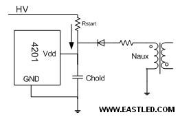 PT4201通過一個連接到高壓線上的電阻Rstart對連接在Vdd腳上的電容Chold充電實現(xiàn)啟動。在上電之初,Chold電容上的電壓為0,PT4201處于關斷狀態(tài),從Rstart上流下的電流對Chold進行充電從而使Vdd電壓升高,當Vdd腳電壓達到芯片啟動電壓VDD-ON之后PT4201開端工作,工作之后流進Vdd電流增加,由幫助繞組開端對芯片進行供電。