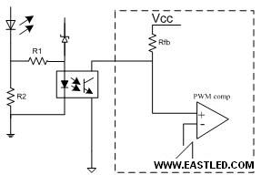 PT4201采用光耦檢測輸出LED串的電流并通過轉變輸出脈沖占空比達到輸出電流把持目標。如圖3所示,當LED電流達到設定值時,LED電流在采樣電阻R2上的壓降達到光耦發(fā)光管導通電壓,發(fā)光管導通使FB電壓降落,PT4201根據(jù)FB電壓的大小轉變輸出脈沖占空比實現(xiàn)恒定電流輸出。