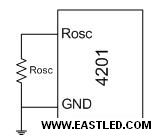 PT4201的Rosc引腳為設定PWM頻率供給了方便,用一個電阻接在Rosc引腳和GND之間可以對PWM頻率進行設定(圖4)。PWM頻率與設定電阻之間的關系遵守以下關系:Fosc=6500/Rosc。FOSC單位KHz,Rosc單位Kohm。