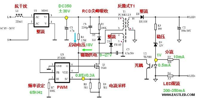 基于PT4201的E27 3W離線式射燈計劃利用線路是典范的反激式的拓撲結構,采用副邊反饋(即光耦反饋),以提高輸出電流精度。相比于原邊反饋電路電流精度+-5%,副邊反饋的電路精度在+-2%以內,本錢只增加了0.3RMB,但卻給大批量生產時供給了方便。
