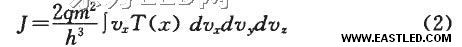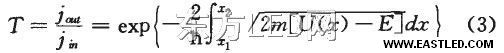 其中q為電子電量,m為電子質(zhì)量,矗為普朗克常數(shù),vx、vy、vz分辨是電子在x、y、z方向的隧穿速度,T(x)為電子的隧穿概率。又任意勢壘的電子隧穿概率可表現(xiàn)為[13]